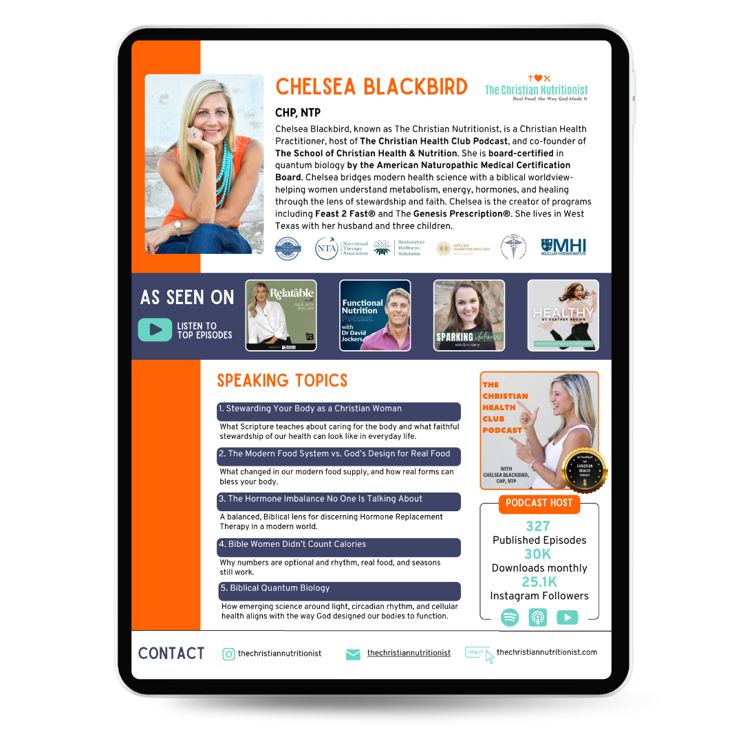 If your audience is ready for a conversation that challenges the noise of modern health and points them back to the way God designed the body to function, Chelsea would be honored to serve them.
